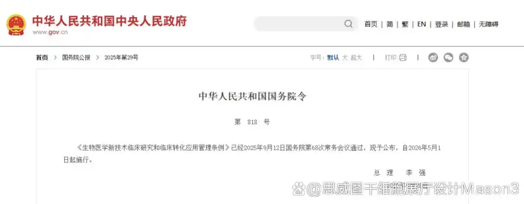 法治框架基本成型?!渡镝t學新技術臨床研究和臨床轉化應用管理條例》正式發布,自2026年5月1日起實施。該條例明確了“研究—轉化—應用”全流程管理要求,對干細胞等前沿技術設立了倫理審查、全過程風險控制、信息公開與機構資質標準,為行業提供了統一、可預期的制度環境。