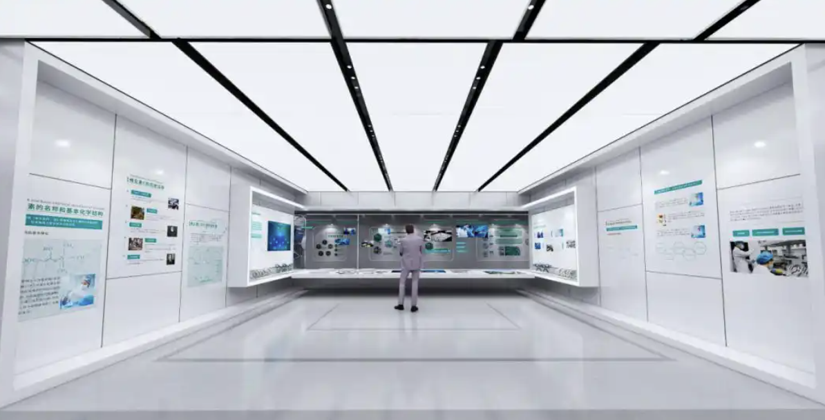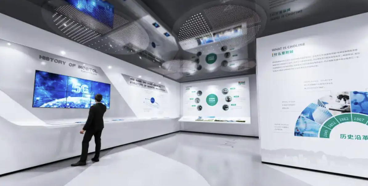 在色彩構成上,以現代白色為主要的空間色彩背景,輔以科技藍色、綠色、橙色點綴,連接整個展廳的脈絡,營造出生物醫藥行業空間色彩的氛圍。